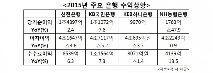 (서울=포커스뉴스) 4대 금융그룹에 속해 있는 4개 은행 중 NH농협은행이 가장 초라한 성적표를 받아들었다. 농협은행의 2015년 당기순이익은 전년 대비 무려 48%가량 줄었으며 은행의 핵심 수익인 이자 및 수수료 수익도 경쟁 은행에 비해 적은 것으로 집계됐다.