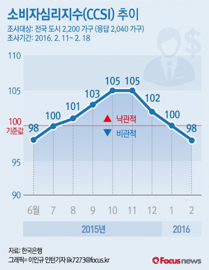 (서울=포커스뉴스) 25일 한국은행이 발표한 '2016년 2월 소비자동향조사 결과'에 따르면 2월 소비자심리지수(CCSI)는 98로 전월 대비 2포인트 하락해 8개월 만에 최저수준을 기록했다. 소비자심리지수가 100보다 작으면 경제상황에 대해 비관적으로 보는 소비자가 많다는 의미다.