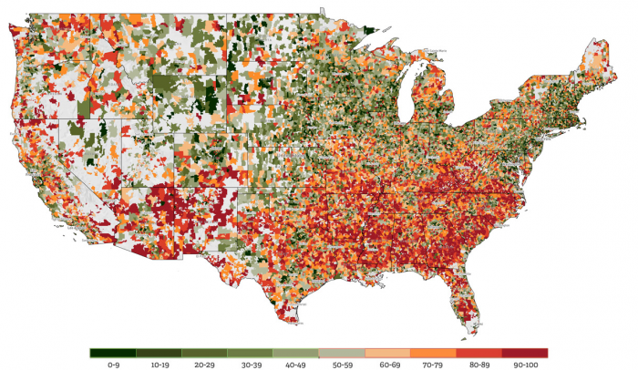 이 최하위 우편번호 집단은 미국인 5000만 명 이상이 사는 곳이다. 이들 가운데 불균형적인 비율이 남부에 집중돼 있다. 보고서에 따르면 남부 주들은 미국 전체 인구의 37%를 수용할 뿐이지만 경제적으로 고통 받는 미국인의 52%를 끌어안고 있다. 미시시피 주민(州民)의 40%와 앨라배마 주민의 35%는 경제적으로 고통스러운 우편번호에 살고 있다. 반면 메인 주민(州民)의 4%, 뉴햄프셔 주민의 2%, 버몬트 주민의 1%만이 그런 우편번호에서 산다.