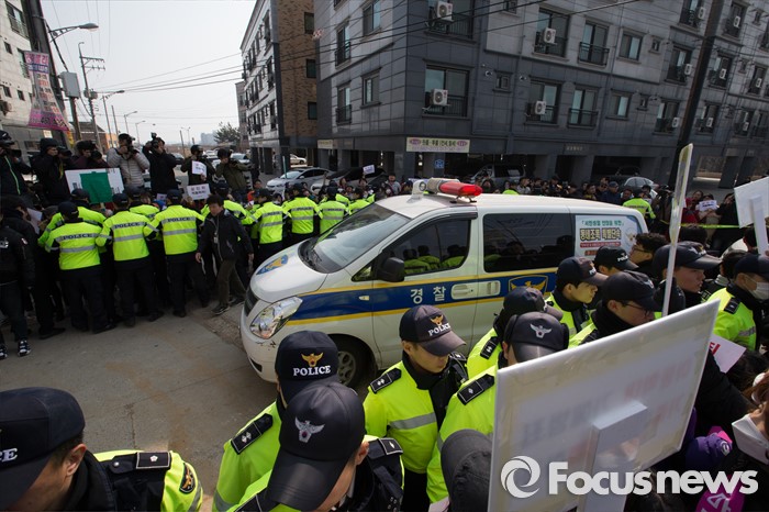 (평택=포커스뉴스) 학대와 무관심 속에 살해당한 신원영 군의 계모 김모 씨와 친부 신모 씨가 14일 오후 경기도 평택시 포승읍 자택에 도착, 기다리던 시민단체 회원들과 시민들이 살인죄 적용을 촉구하는 구호를 외치고 있다.