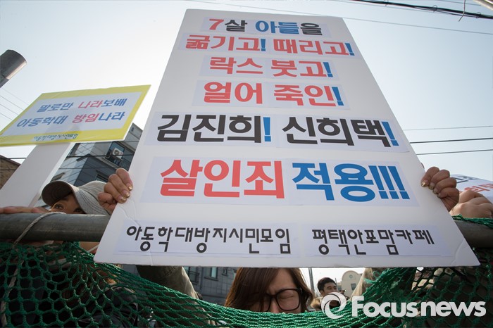 (평택=포커스뉴스) 학대와 무관심 속에 살해당한 신원영 군의 계모 김모 씨와 친부 신모 씨가 14일 오후 경기도 평택시 포승읍 자택에 도착, 기다리던 시민단체 회원들과 시민들이 살인죄 적용을 촉구하는 구호를 외치고 있다.