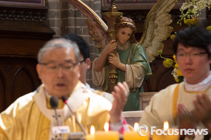 (서울=포커스뉴스) 부활절을 맞아 27일 정오 서울 중구 명동성당에서 염수정 추기경이 '예수 부활 대축일 미사'를 집전하고 있다.