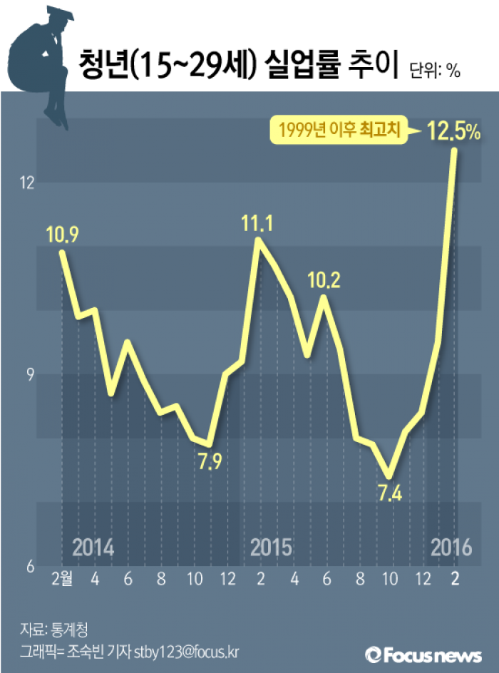 (서울=포커스뉴스) 2월 청년실업률이 1999년 이후 최대치인 12.5%로 집계된 가운데 전국 도시 가구는 6개월 후에도 취업 환경이 나아지지 않을 것이라고 내다봤다.