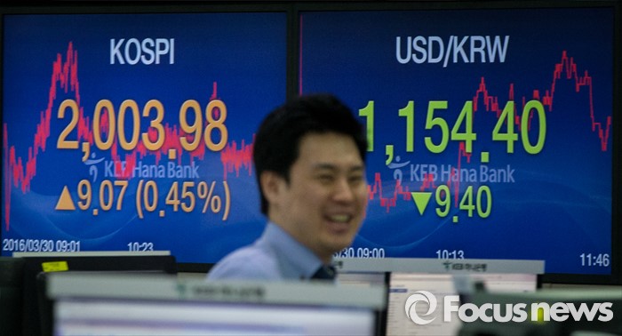 (서울=포커스뉴스) 30일 서울 중구 KEB외환은행 본점 딜링룸 전광판에 코스피 지수가 전일보다 9.07p (0.45%) 상승한 2003.98, 원달러환율은 전일보다 9.40원 하락한 1154.40원을 나타내고 있다. 이날 코스피지수는 재닛 옐런 미국 중앙은행(Fed) 의장의 비둘기파 발언에 힘입어 시가 기준 2000선을 돌파했다. 코스피가 시가 기준으로 2000선을 돌파한 것은 지난해 12월24일(2009.34) 이후 처음이다.