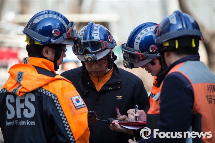 (서울=포커스뉴스) 30일 오후 2시께 서울 서초구의 한 아파트에서 원인모를 불이나 소방관들이 진화작업을 논의하고 있다.