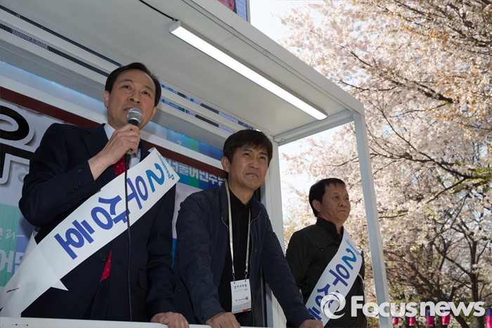 (서울=포커스뉴스) 11일 오후 서울 서대문구 청소년수련관 앞에서 우상호 더불어민주당 서대문구갑 후보가 영화배우 안내상, 우현과 함께 유세를 하고 있다.
