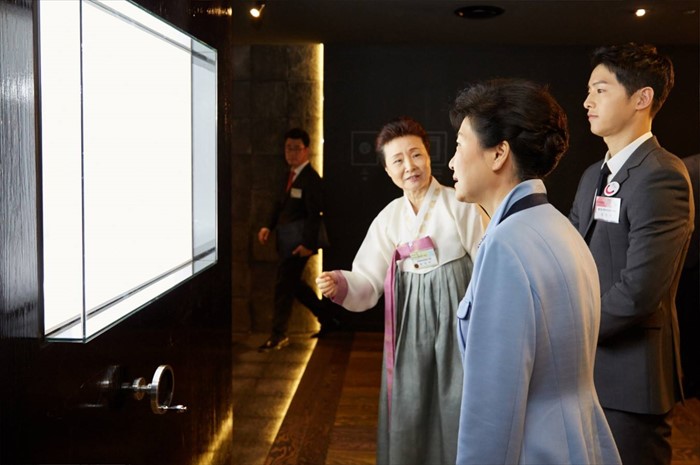 (서울=포커스뉴스) 박근혜 대통령은 11일 오전 서울 중구 한국관광공사 서울센터에서 열린 K-스타일 허브(K-Style Hub) 한식문화관 개소식에서 배우 송중기 및 윤숙자 한식재단 이사장 등과 함께 전시관들을 둘러보고 있다. <사진출처=청와대>