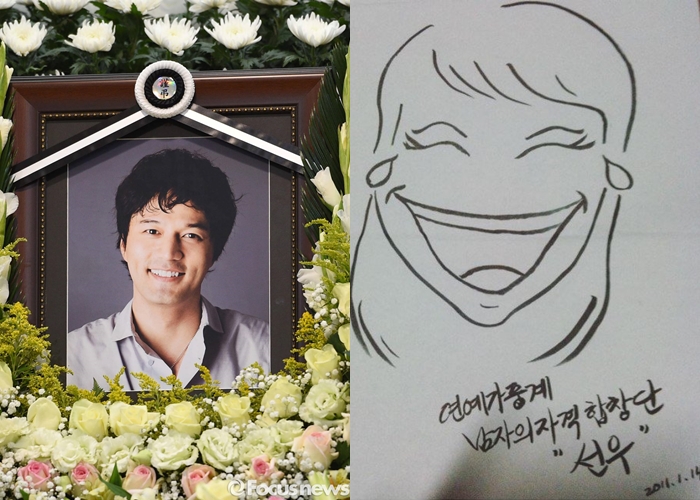 뇌사 판정을 받고 장기를 기증한 뒤 사망한 배우 故김성민의 빈소가 26일 오후 서울 서초구 가톨릭대학교 성모병원 장례식장에 마련됐다.탤런트 겸 가수 선우가 26일 SNS를 통해 고(故) 김성민을 애도했다.<사진출처=김성민 영정사진(좌)-포커스뉴스 DB/ 선우 그림-선우 SNS>