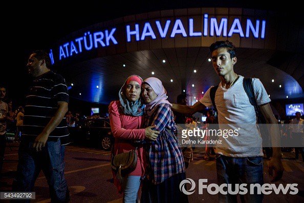 (이스탄불/터키=게티/포커스뉴스) 터키 이스탄불 아타튀르크 공항 이용객들이 29일 새벽(현지시간) 테러 현장을 빠져 나가고 있다.