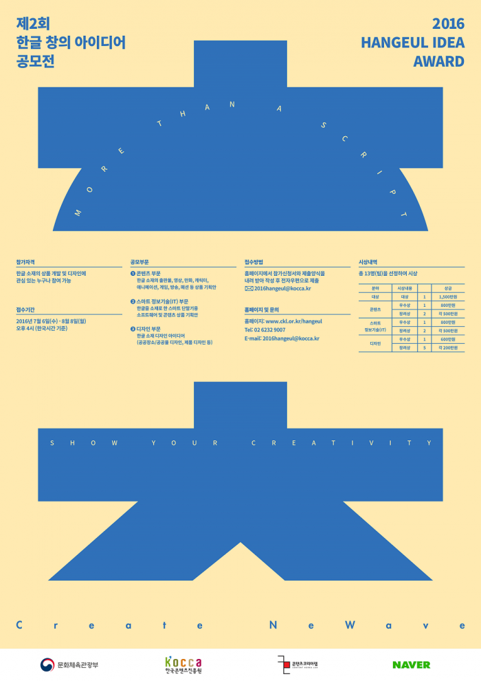 한국콘텐츠진흥원이 주관하고 네이버가 후원하는 이번 공모전은 오는 6일부터 접수를 시작한다. 이번 공모전은 한글과 다른 분야와의 융합을 통해 한글의 문자적 가치 이상의 새로운 한글 상품과 디자인 아이디어를 발굴하기 위해 전 세계인을 대상으로 추진되는 국제공모전이다.