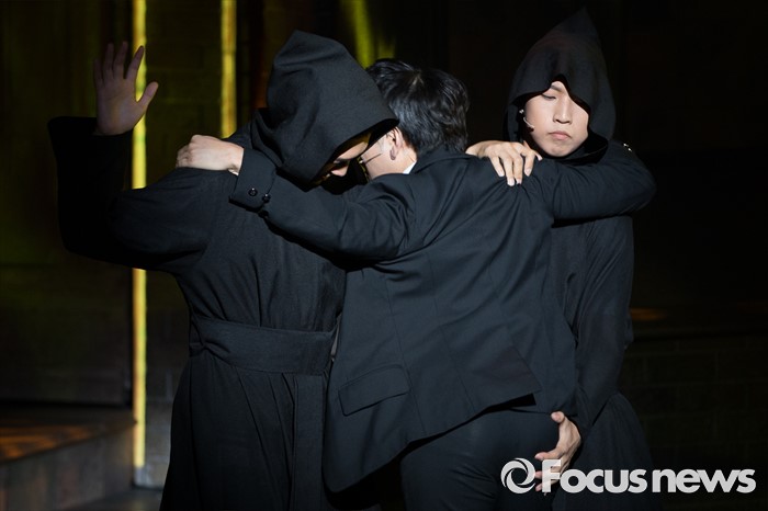(서울=포커스뉴스) 5일 오후 서울 종로구 두산아트센터에서 열린 베어 더 뮤지컬 프레스콜에 참석한 배우들이 공연 하이라이트 시연을 하고 있다.