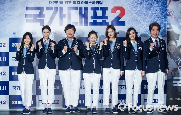 (서울-포커스뉴스) 6일 오전 서울 중구 동대문 메가박스에서 열린 영화 '국가대표2' 제작보고회에 참석한 출연진이 포토타임을 갖고 있다. 왼쪽부터 배우 진지희, 김예원, 하재숙, 김슬기, 오연서, 수애, 오달수.