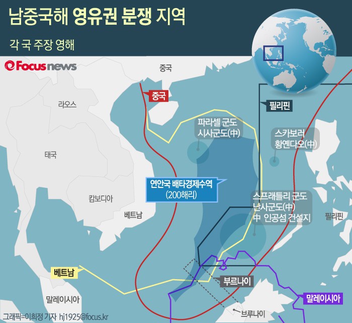 앞서 네덜란드 헤이그 소재의 PCA는 11일(현지시간) '중국이 남중국해 해역에 대해 역사적인 권리를 주장하는 것에는 어떠한 법적인 근거도 없다'며 영유권 분쟁에 대해 필리핀 승소 판결을 내렸다.(워싱턴/미국=게티/포커스뉴스) 기시다 후미오 일본 외무상. 2016.02.15 ⓒ게티이미지/이매진스 (서울=포커스뉴스) 남중국해 부근은 중국과 베트남, 필리핀, 말레이시아 등이 서로 영유권을 주장하고 있는 분쟁지역이다. 2016.01.04 이희정 기자