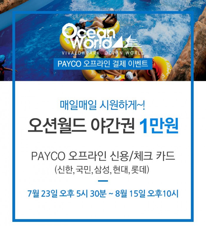 NHN엔터 전수용 제휴협력본부장은 "국내 워터파크를 대표하는 오션월드와 원마운트에 페이코 간편결제 서비스를 적용해 회원들에게 여름 휴가철에 맞춘 혜택을 제공하고, 워터파크 이용자들은 편리한 오프라인 결제로 성수기 결제시간을 단축하는 효과를 얻을 수 있을 것"이라고 밝혔다.페이코, 오션월드 야간권 할인 프로모션 <사진제공=NHN엔터>
