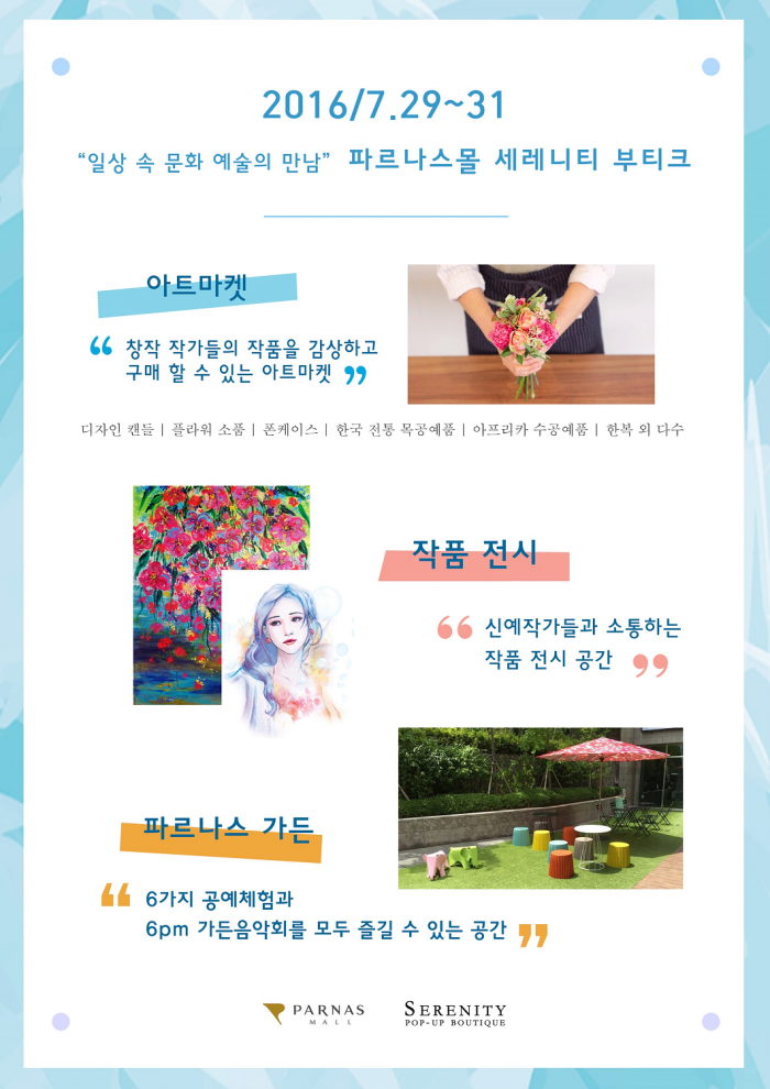 (서울=포커스뉴스) 파르나스호텔이 운영하고 있는 프리미엄 쇼핑몰 파르나스몰는 창작 아트 플리마켓 행사인 '세레니티 부티크'를 오는 29일부터 31일까지 3일간 오전 10시부터 오후 9시까지 선보인다.
