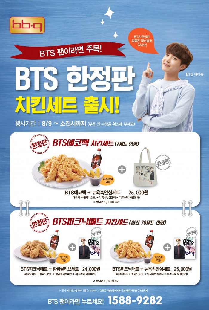 (서울=포커스뉴스) 치킨 프랜차이즈 비비큐가 전속모델 방탄소년단 멤버들이 새겨져 있는 에코백과 피크닉매트를 증정하는 BTS 한정판 치킨세트를 9일 출시했다.