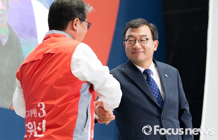 (서울=포커스뉴스) 9일 오후 서울 송파구 잠실실내체육관에서 열린 제4차 새누리당 전당대회에서 당대표로 선출된 이정현(왼쪽) 의원이 최고위원 조원진 의원과 악수를 하고 있다.