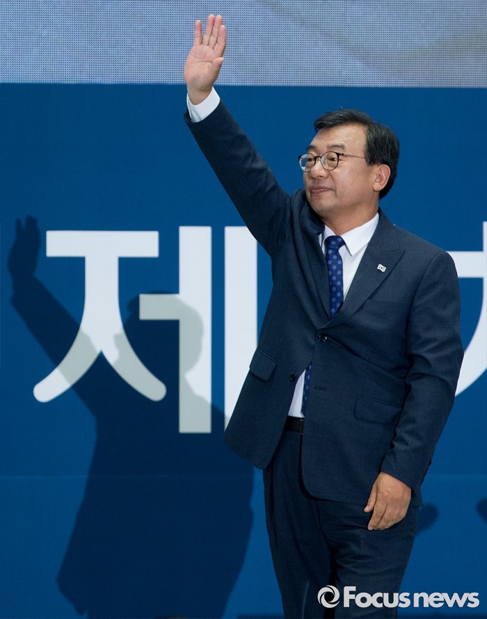 (서울=포커스뉴스) 9일 오후 서울 송파구 잠실실내체육관에서 열린 새누리당 4차 전당대회에 참석한 이정현 의원이 당대표로 선출된 후 수락연설에 앞서 인사하고 있다.